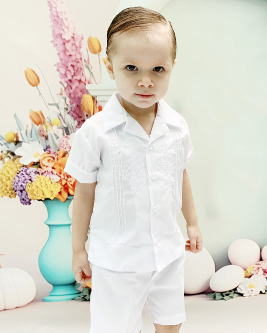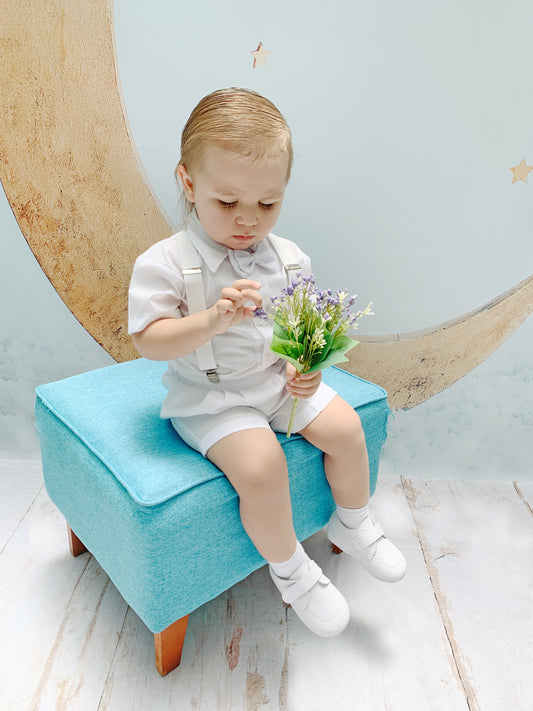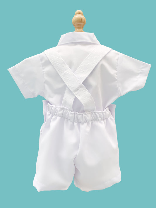 Traje 4 piezas tirantes blancos estilo pantalón o short