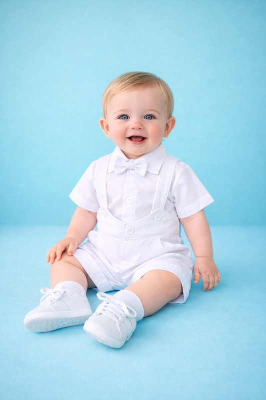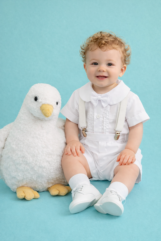 Traje 4 piezas Peter Pan tirantes blancos estilo pantalón o short