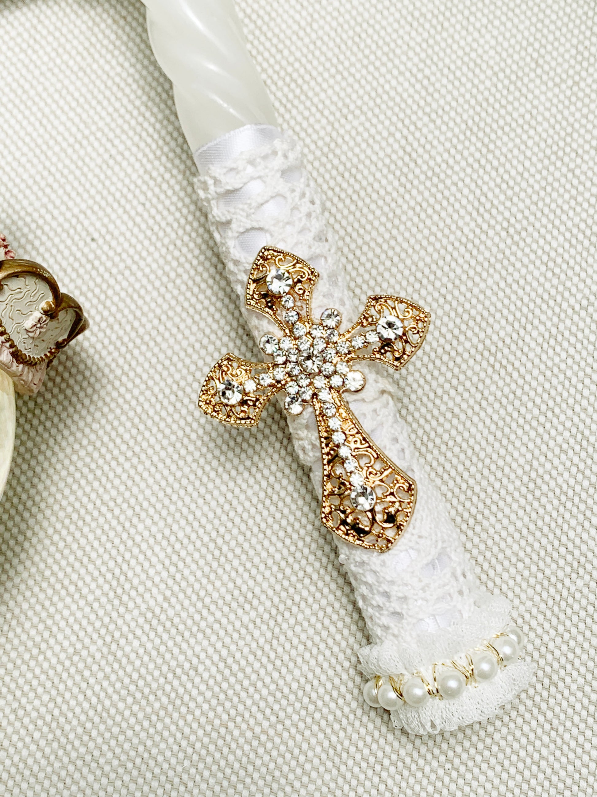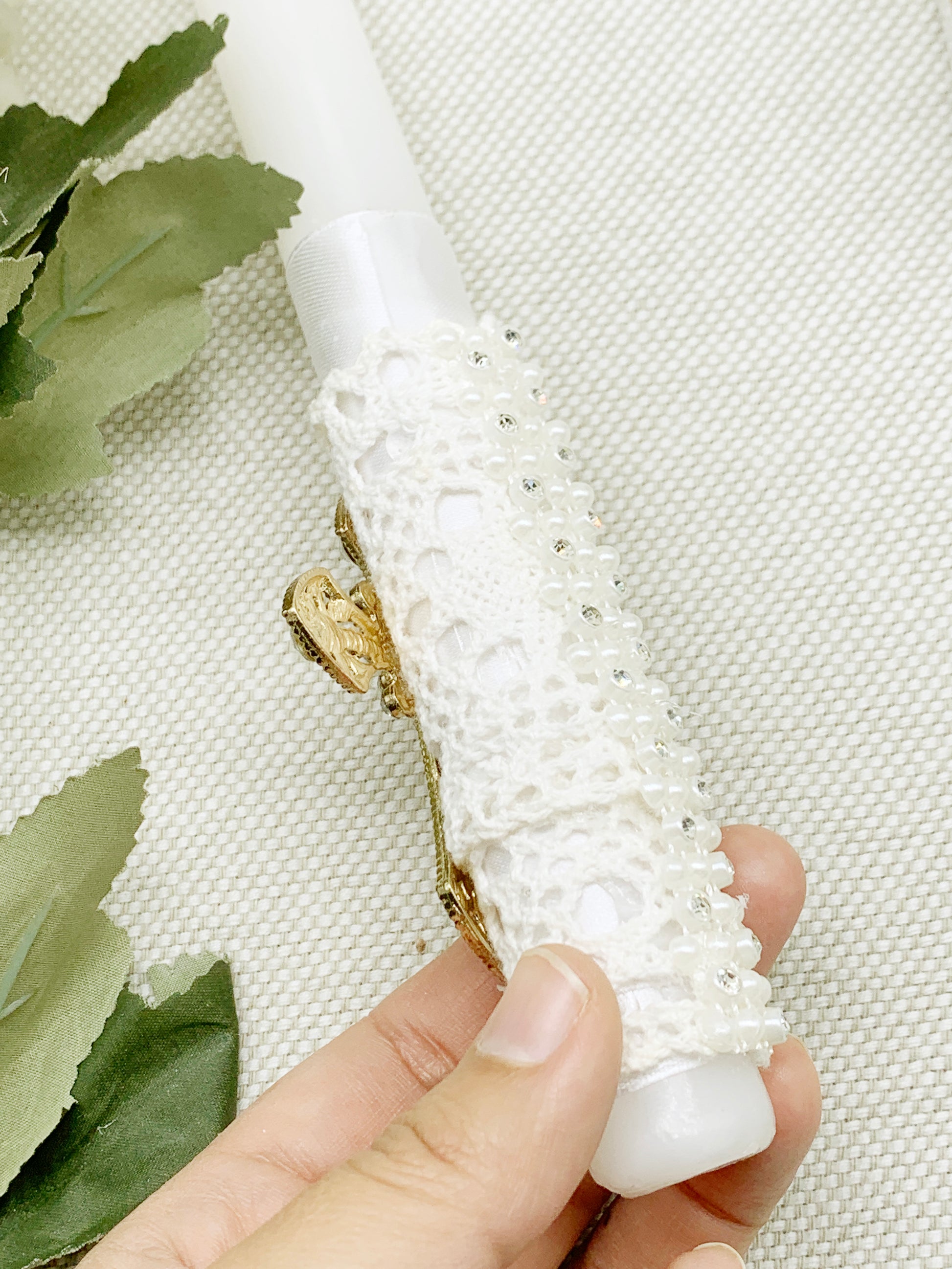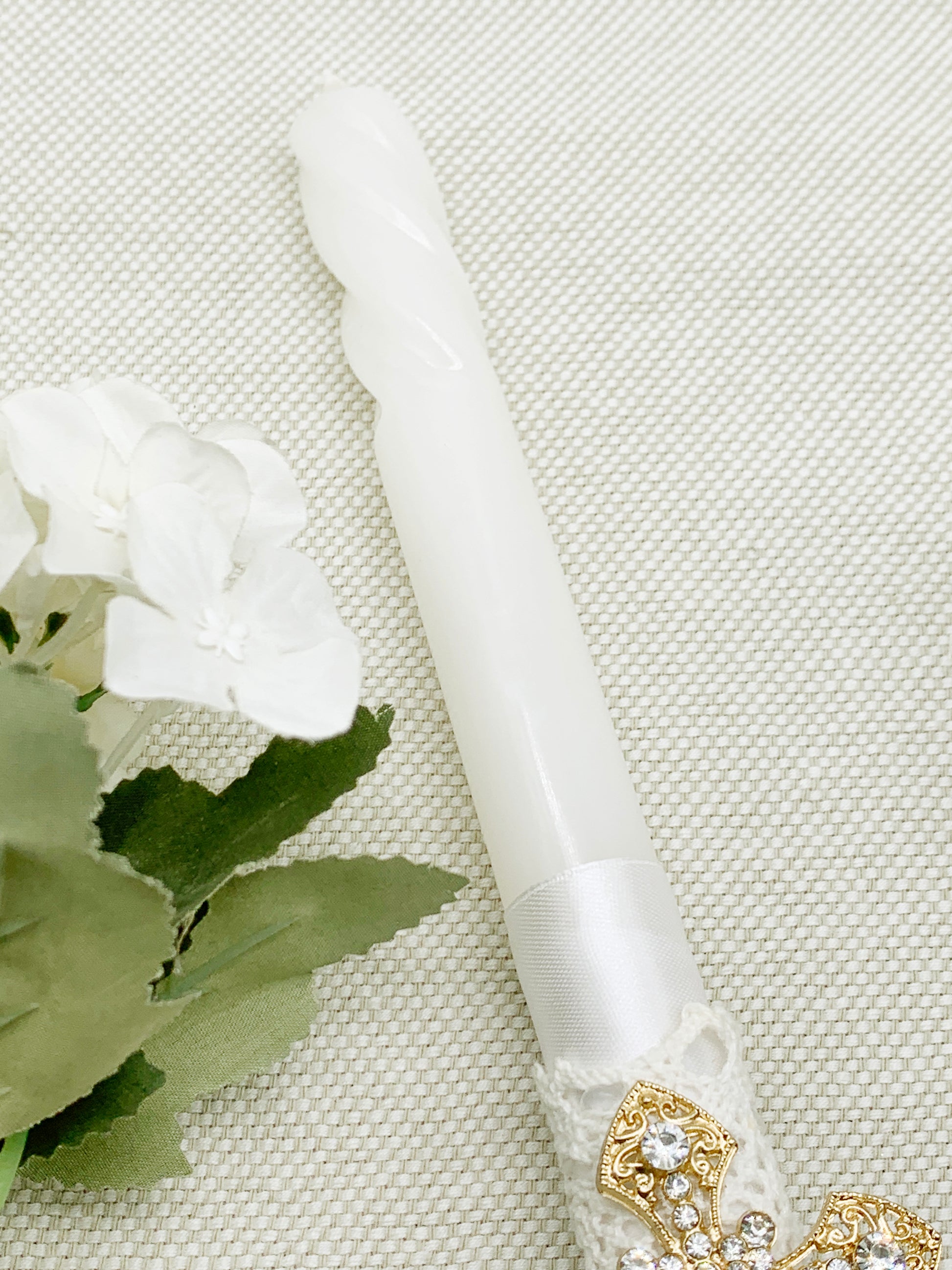 Candela torneada hecha a mano y decorada artesanalmente con detalles en pedrería.