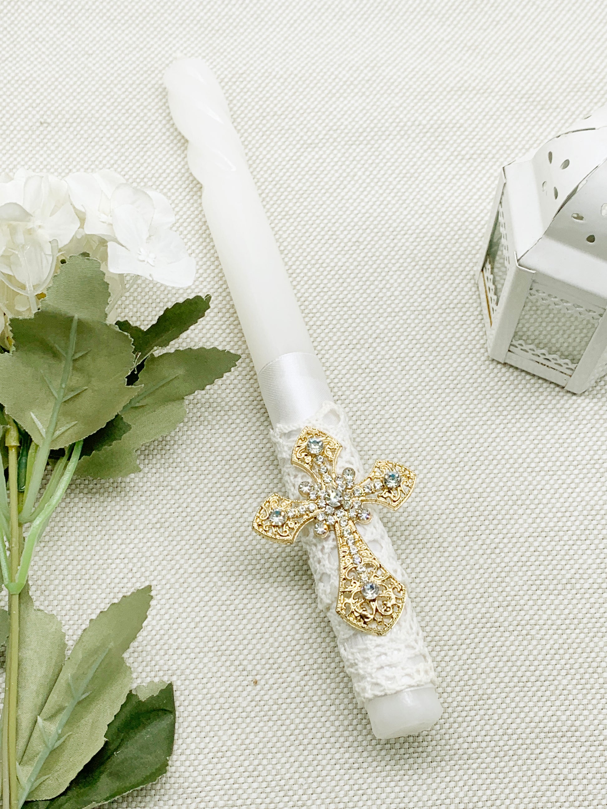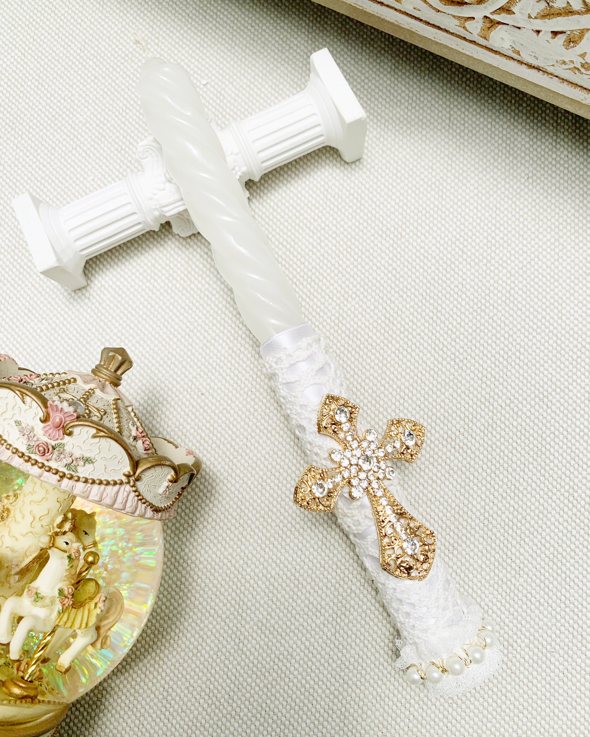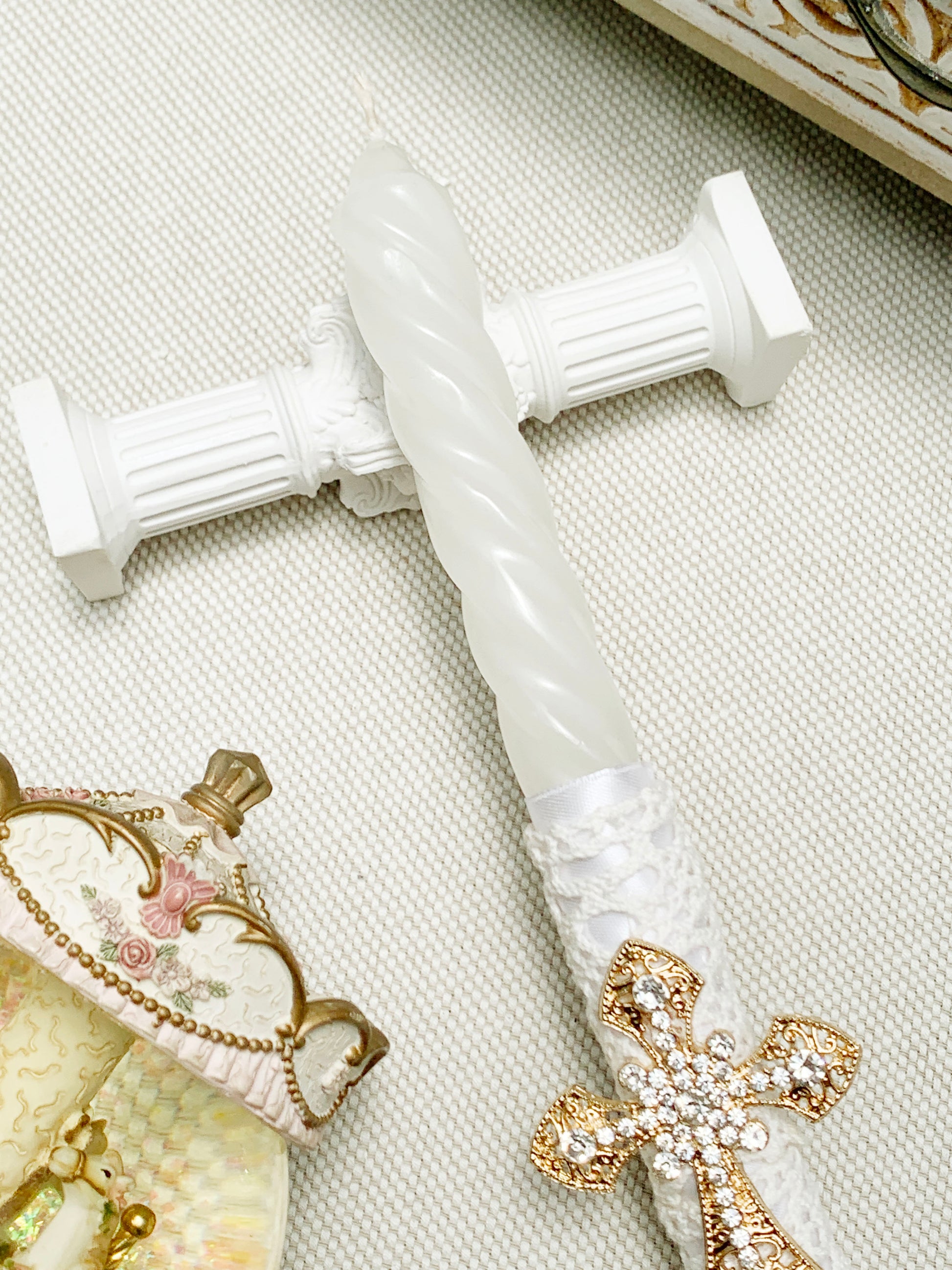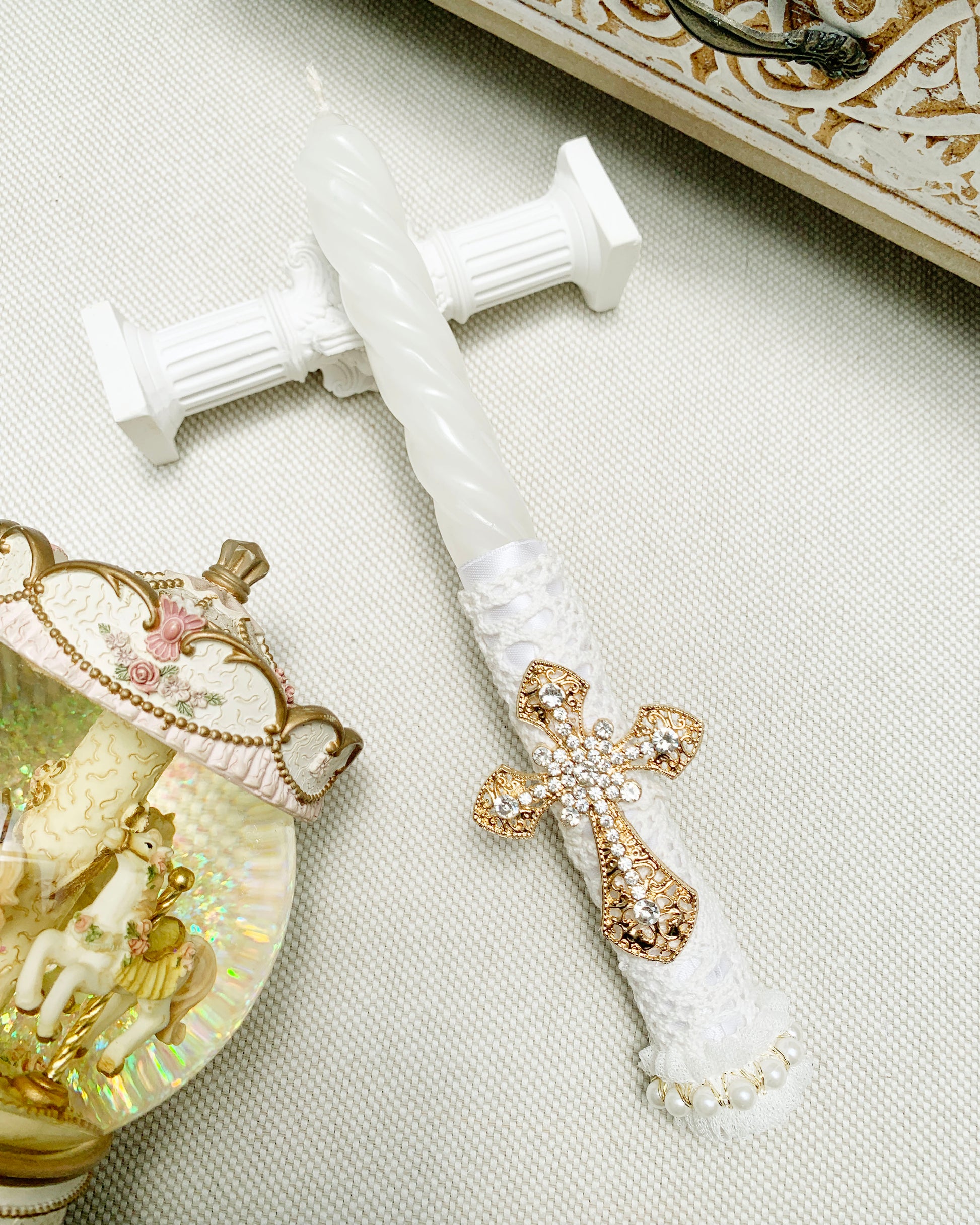 Candela torneada hecha a mano y decorada artesanalmente con detalles en pedrería.