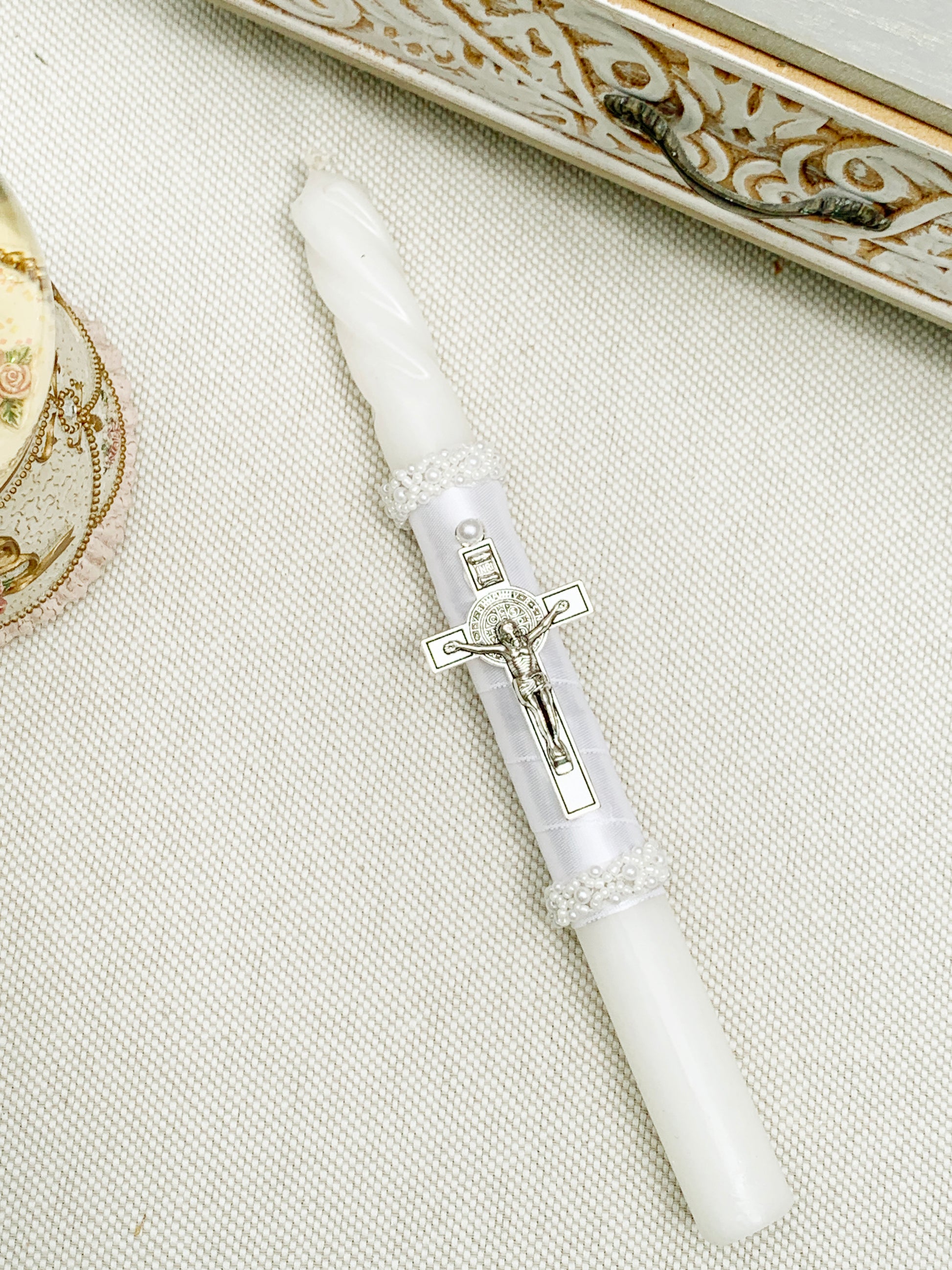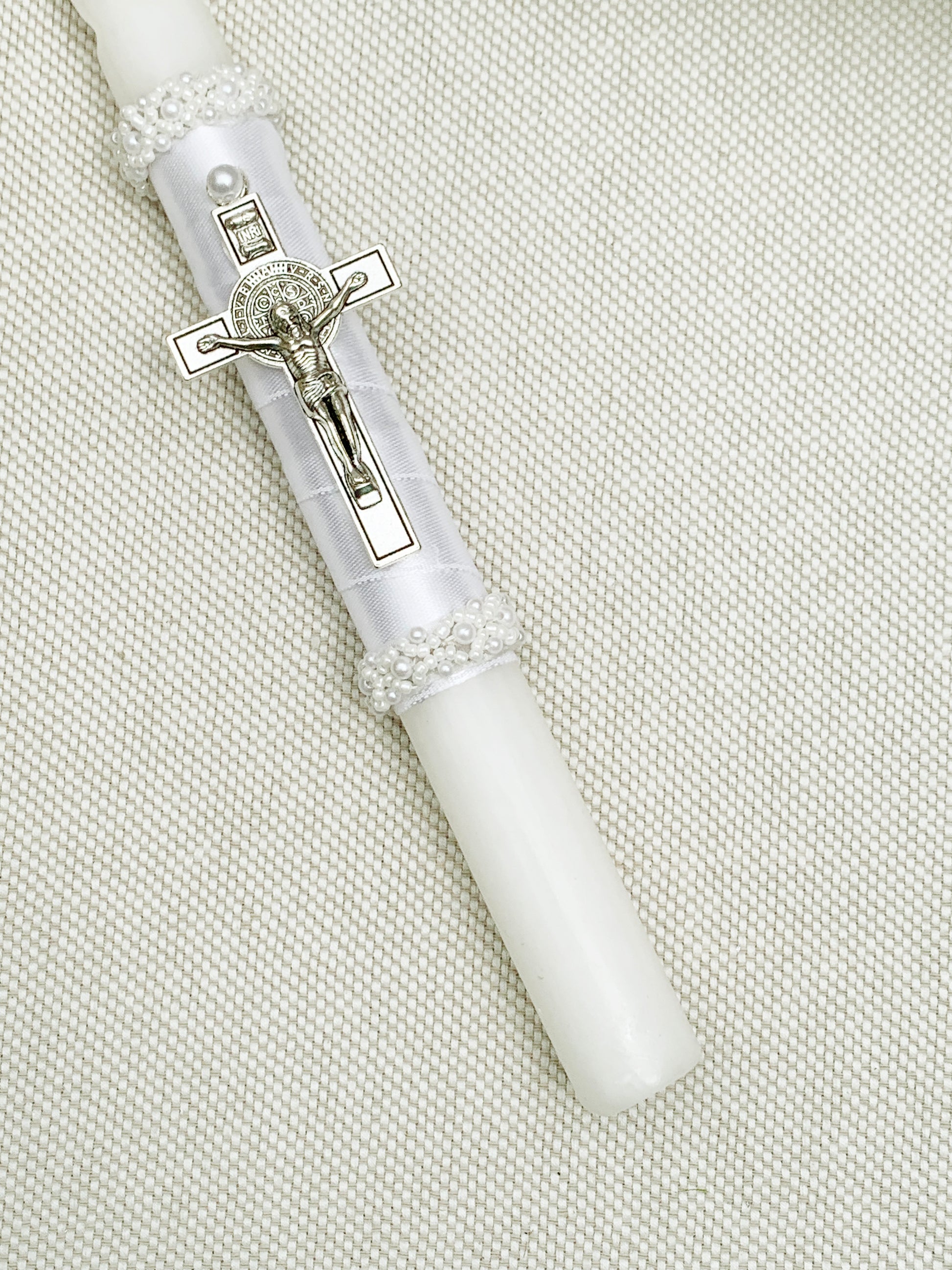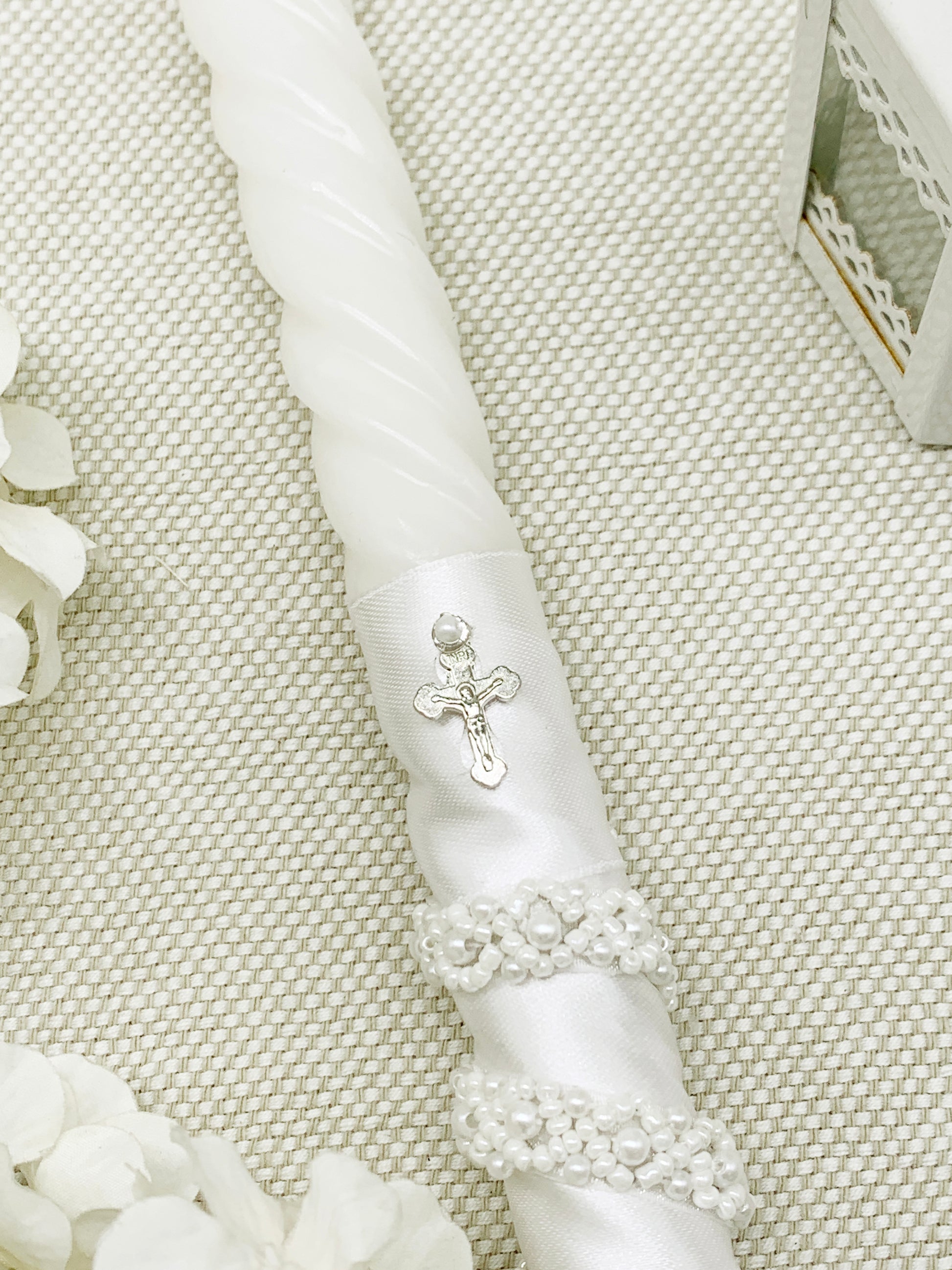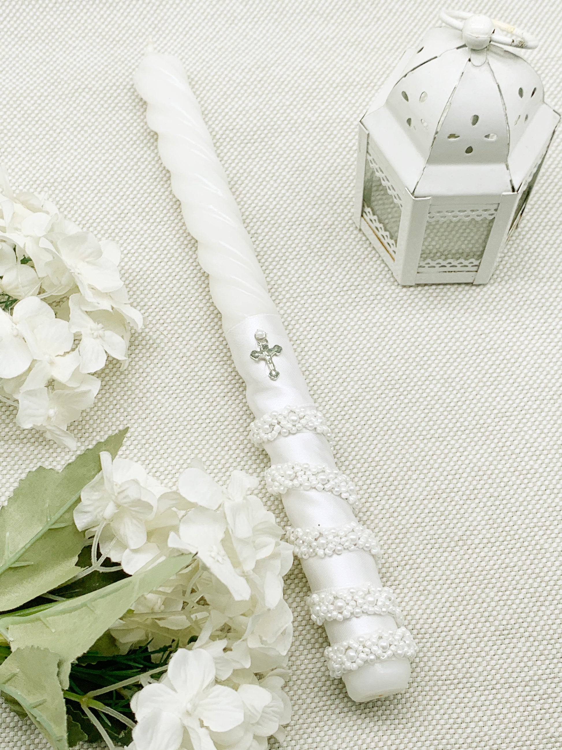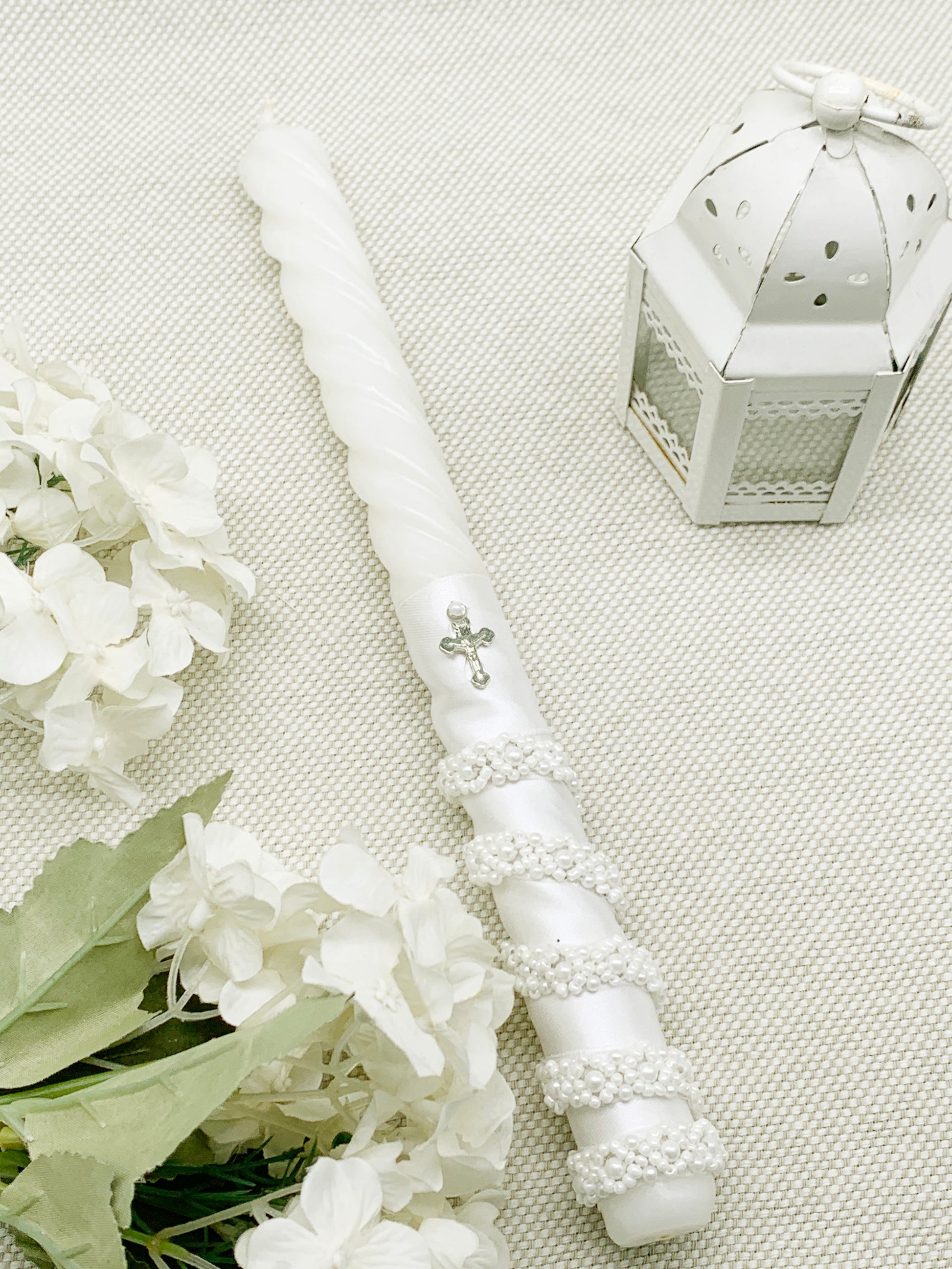 Candela torneada hecha a mano y decorada artesanalmente con cadenilla en abalorios en cada extremo