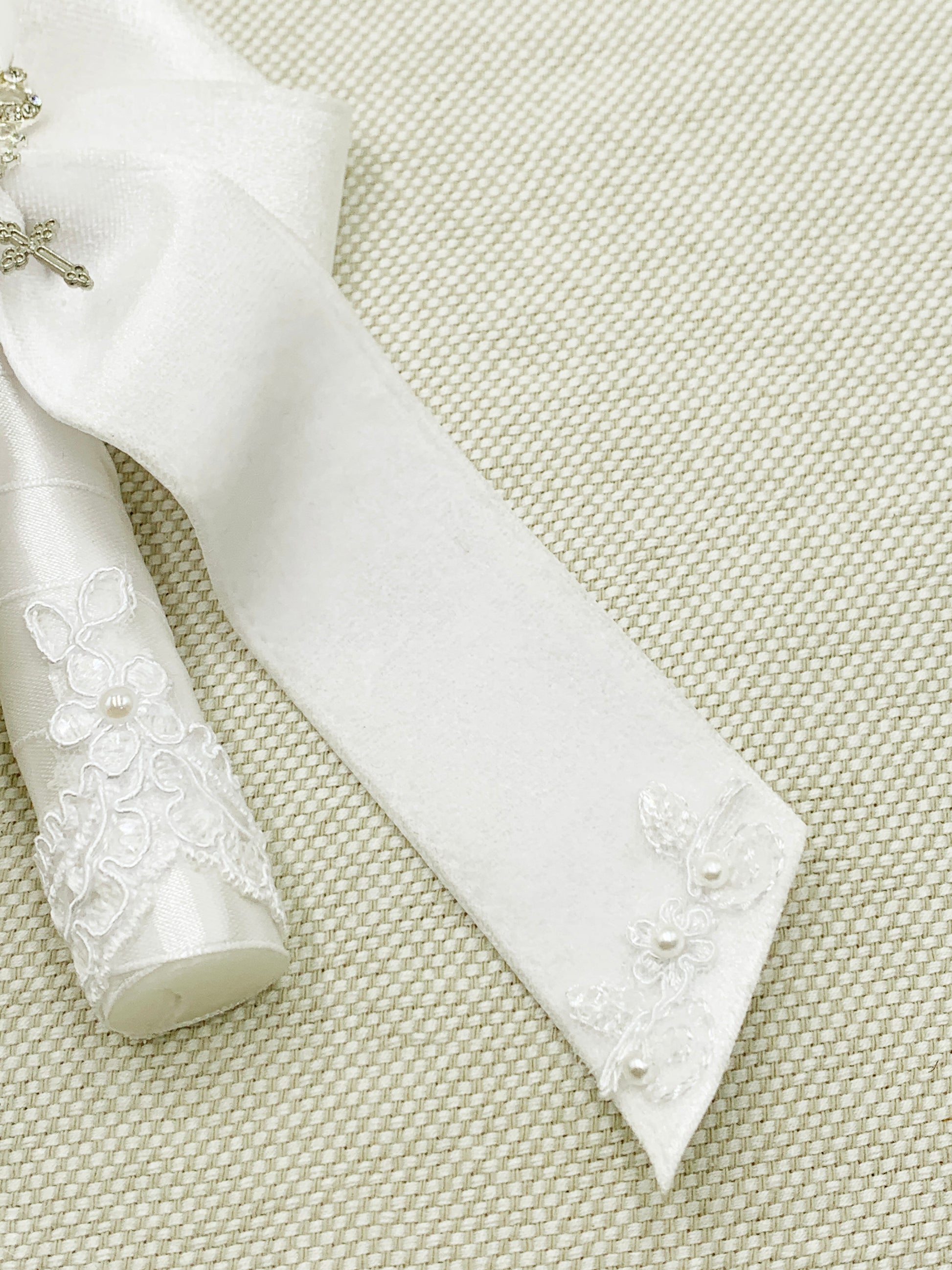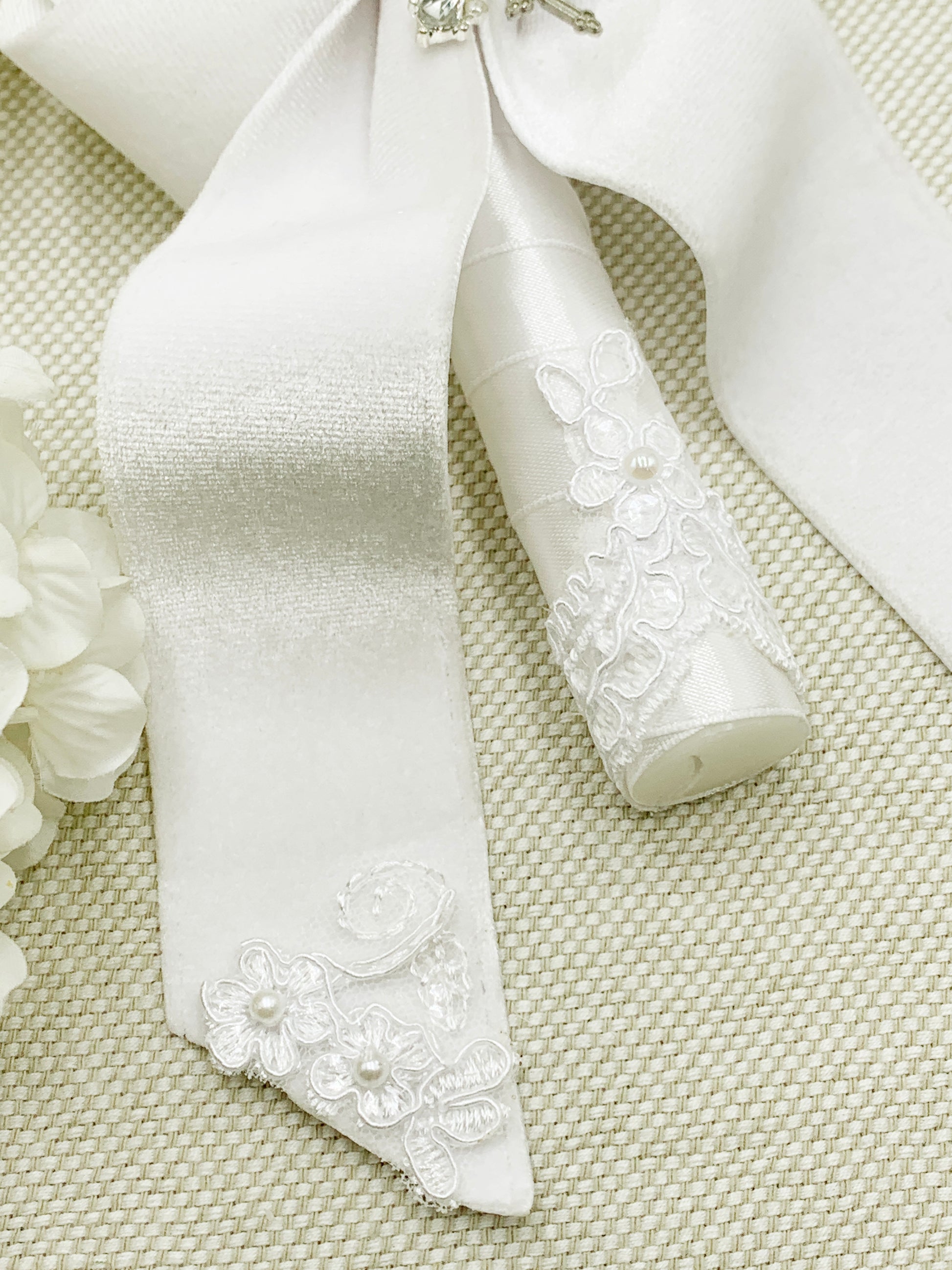 Cinta, encaje, flores de tela hechas a mano y pedrería.