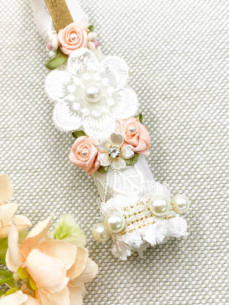 Cinta, encaje, flores de tela hechas a mano y pedrería.