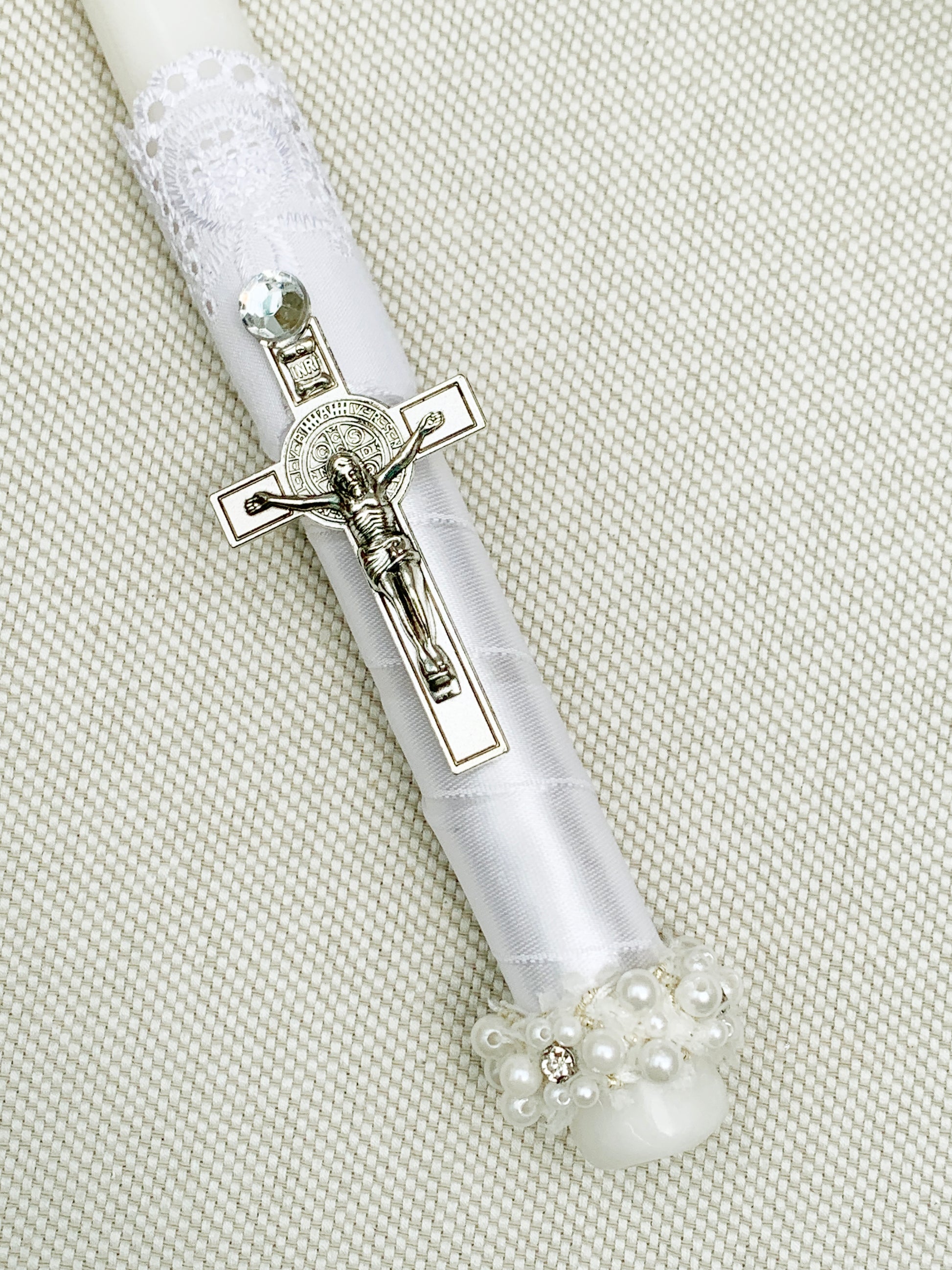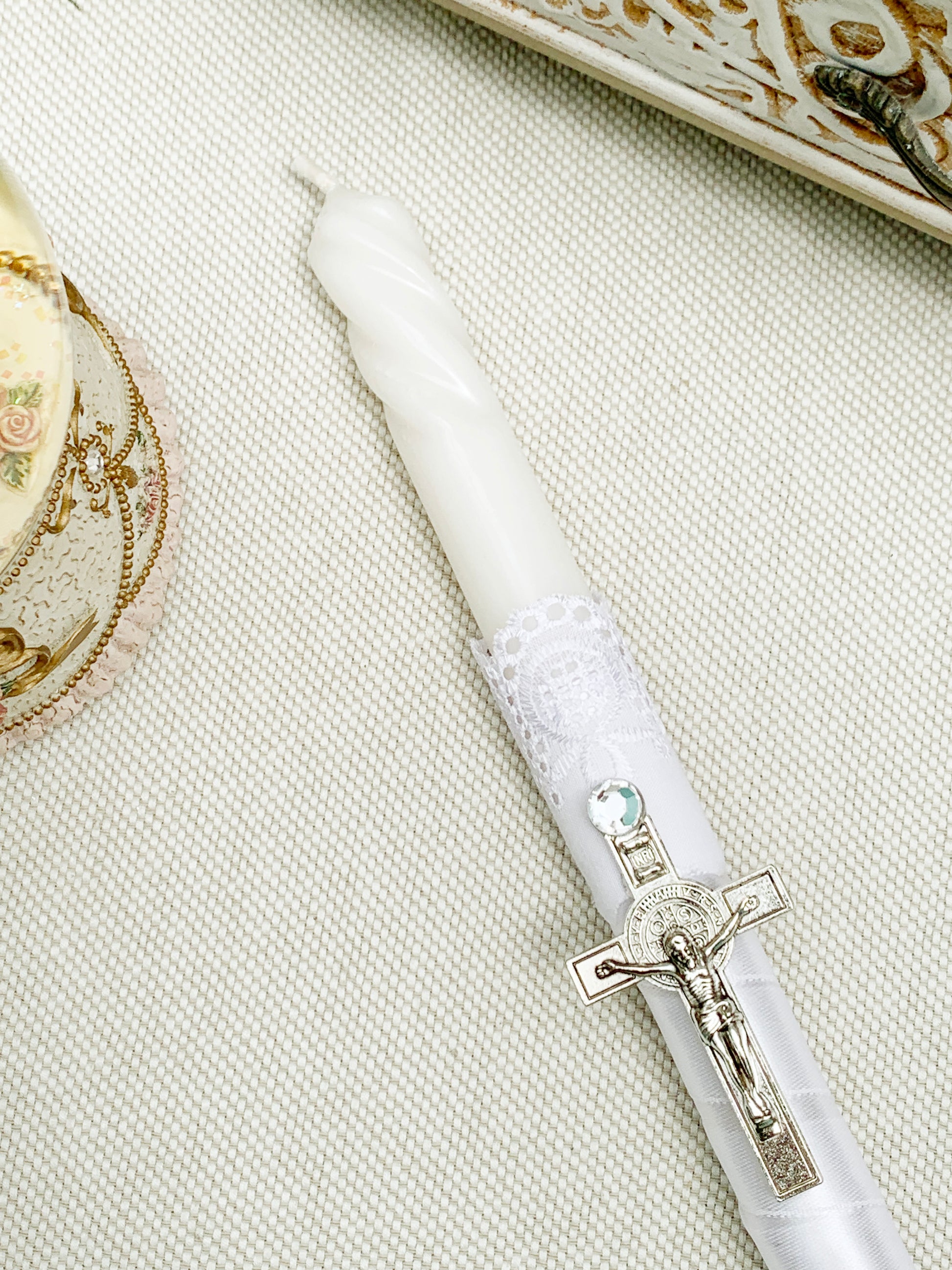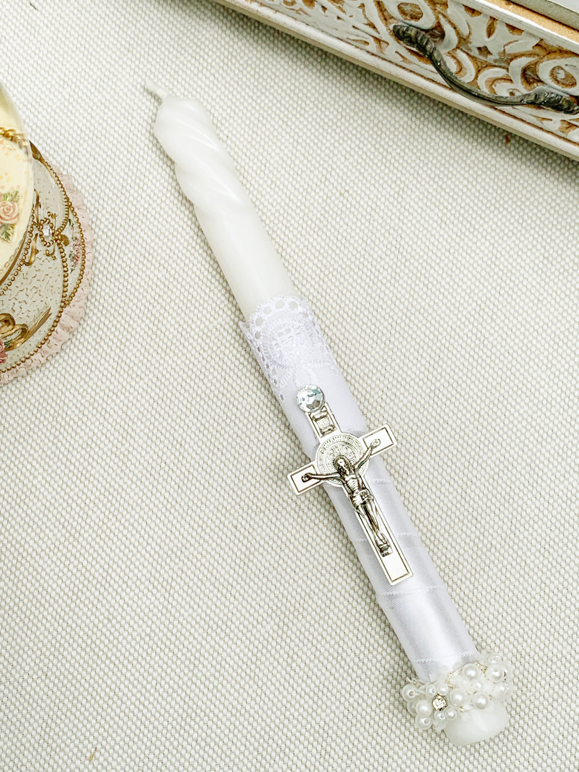 Candela torneada hecha a mano y decorada artesanalmente con encaje.