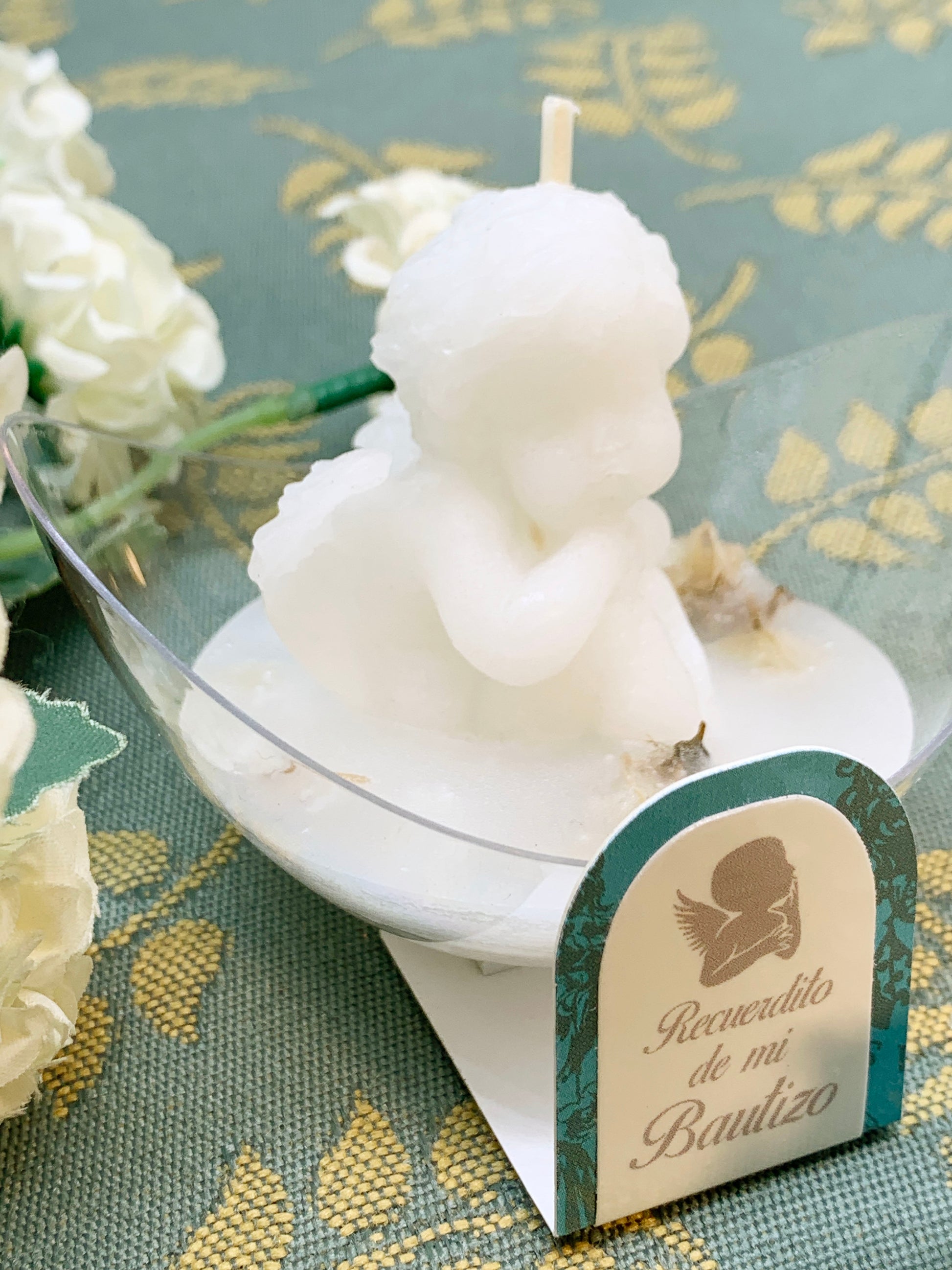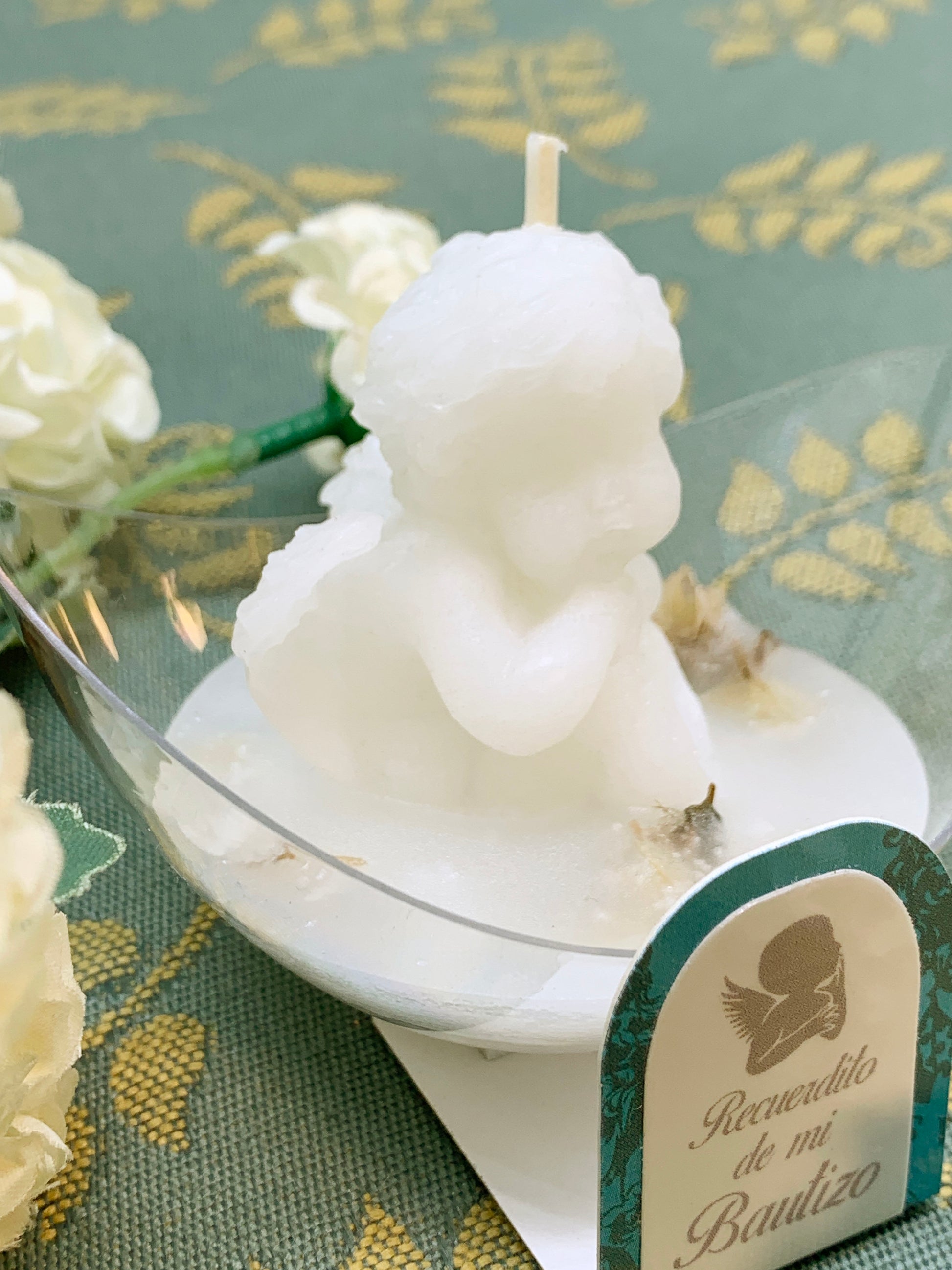 Candelita aromática olor de temporada con escultura de angelito de la guarda y flores secas naturales.