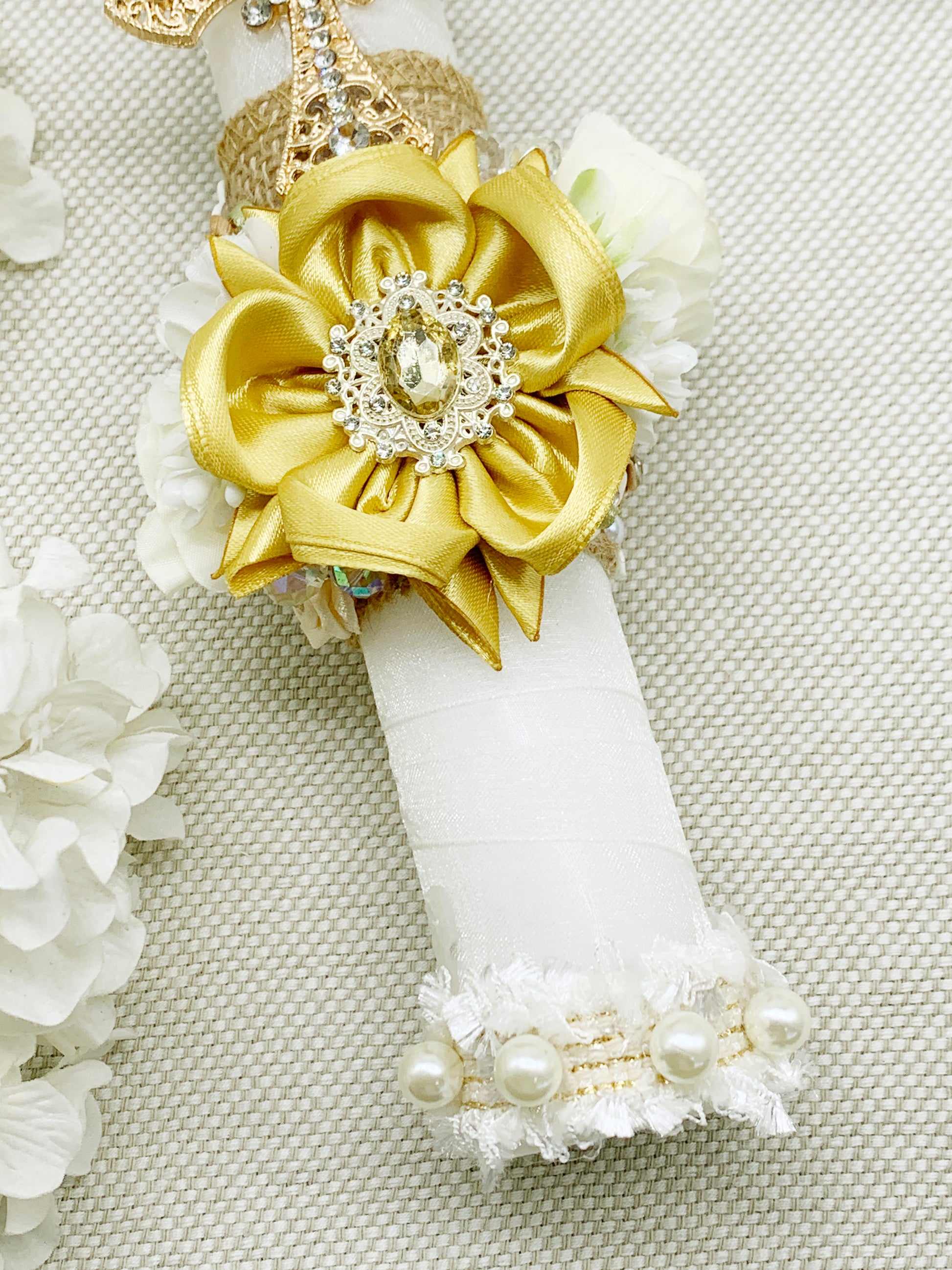 Cirio Bautismal decorado artesanalmente con detalles en dorado.