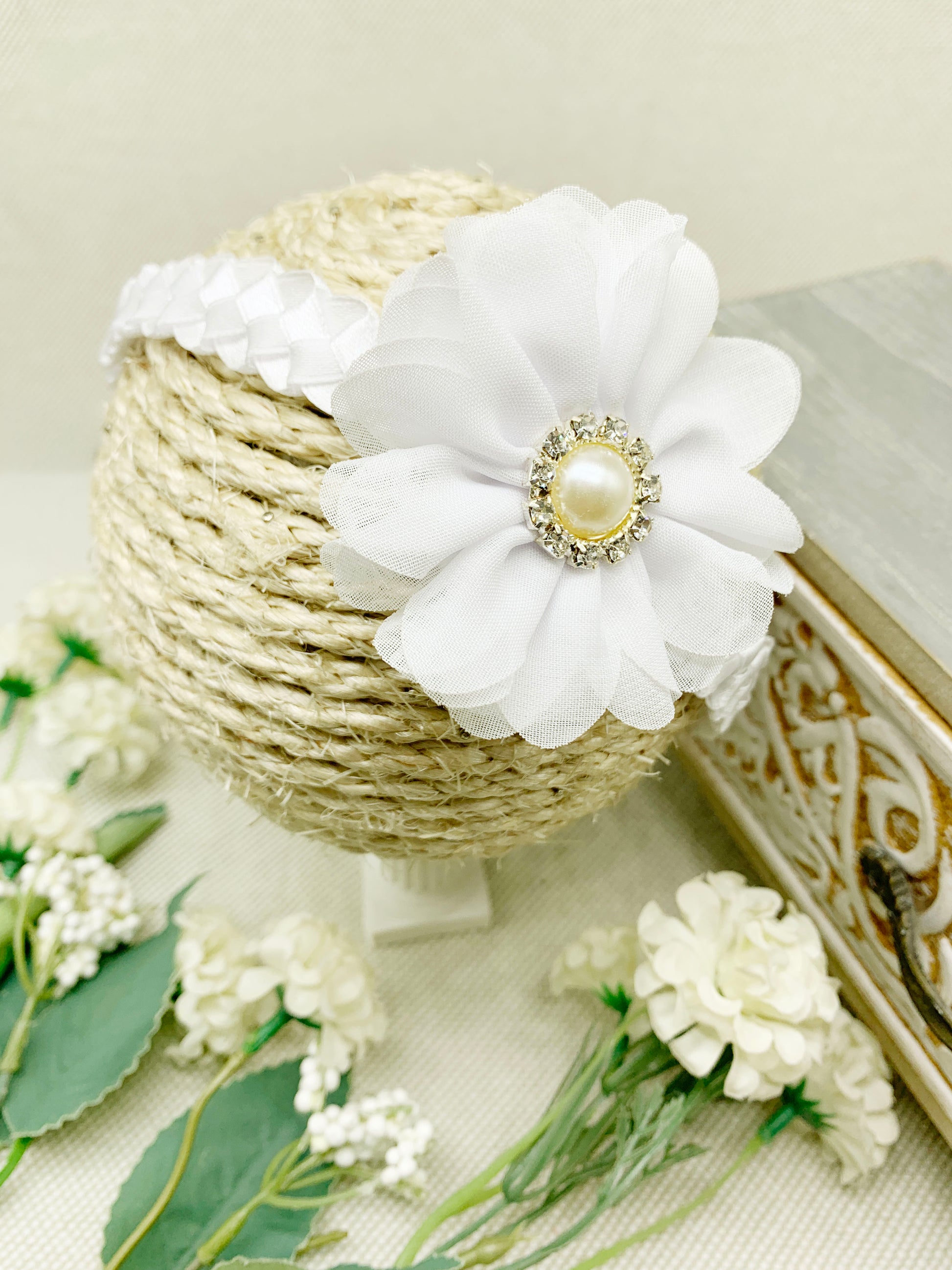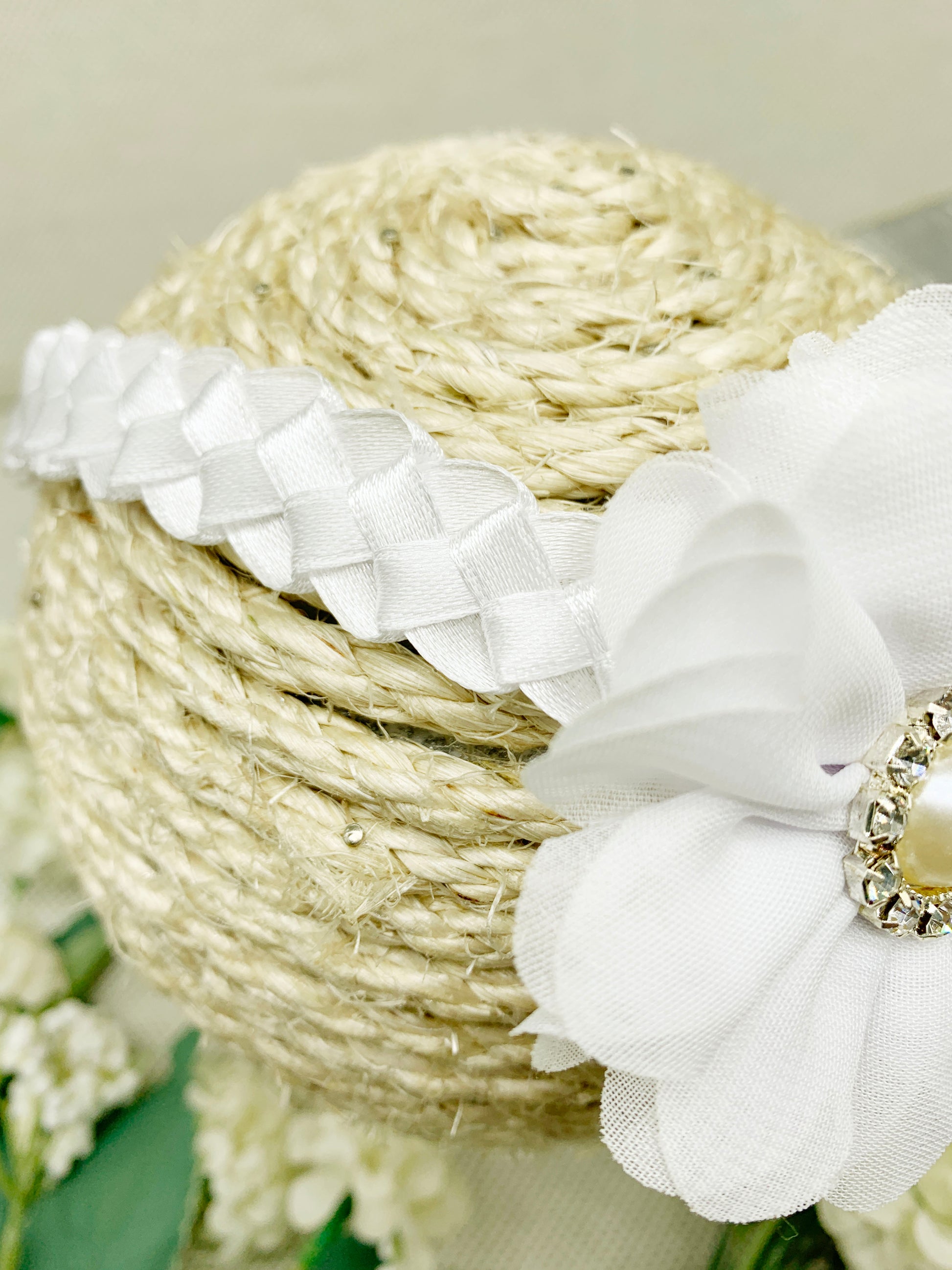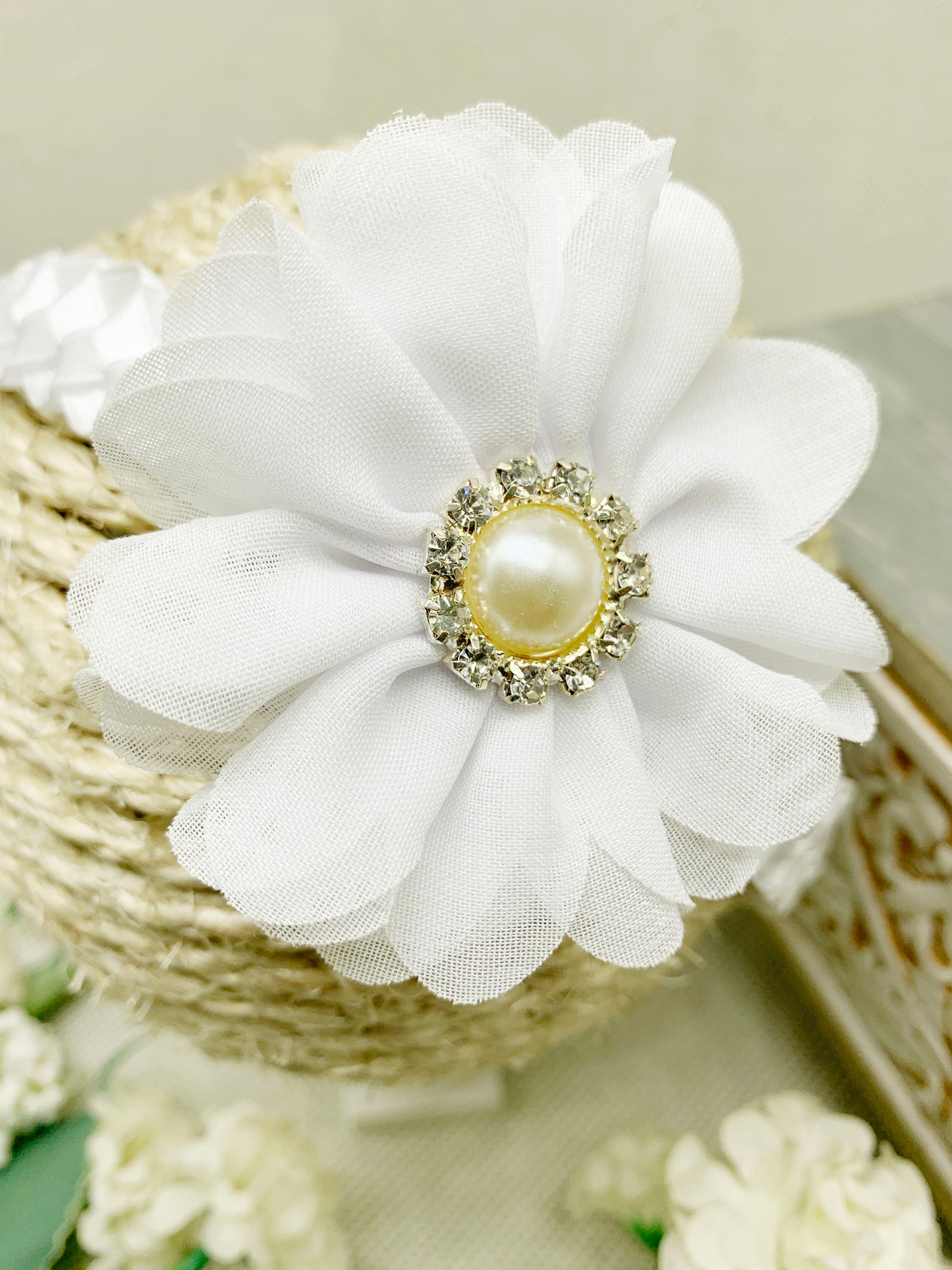 Encaje, flores hechas a mano, banda elástica y pedrería.